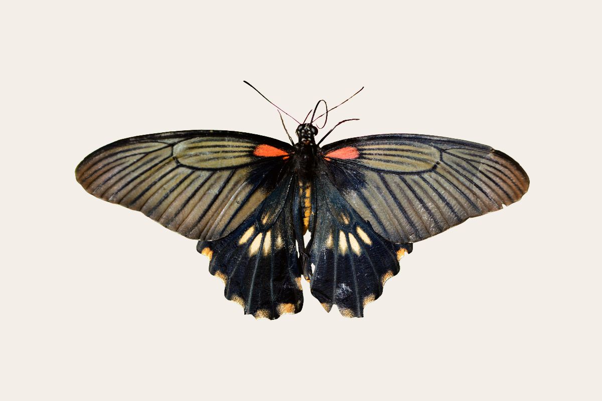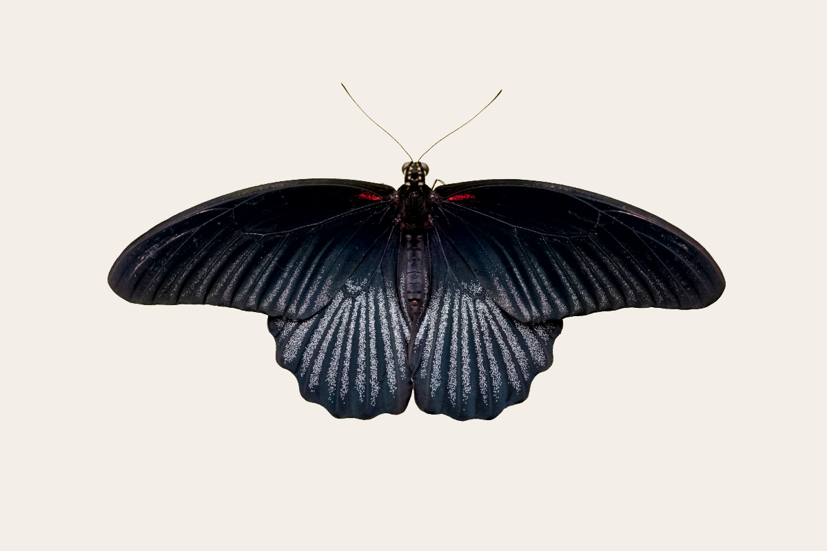 Male Great Mormons have dark wings with a subtle blue-green shimmer and scalloped edges. Some females mimic toxic butterfly species to warn predators away, while others don’t. This dramatic difference between males and females is called sexual dimorphism, and the additional variety among females is relatively rare in the butterfly world.